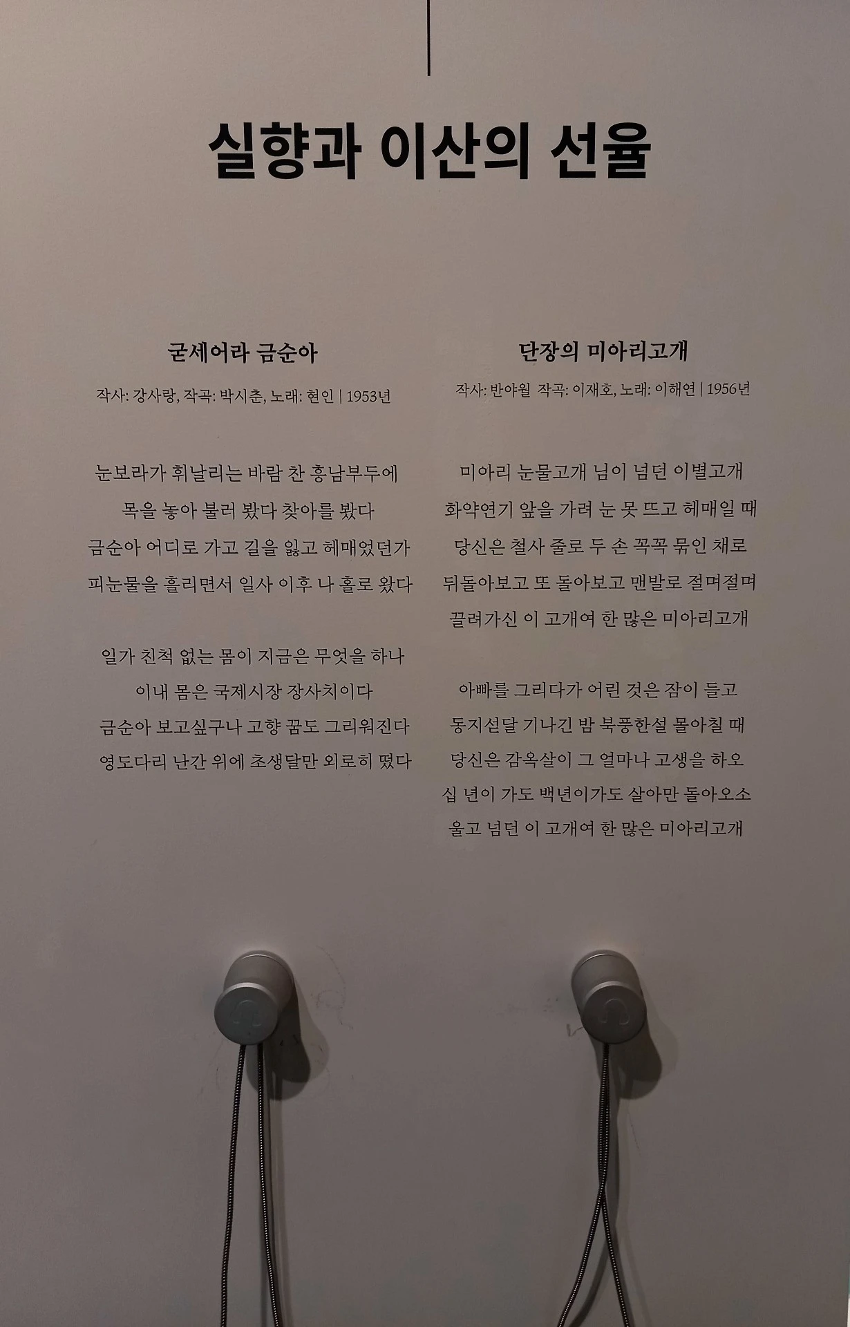 이번에도 노래 감상 전시로 시작, 나훈아의 “고향역”과 정지용의 시에 이동원∙박인수 님이 부른 제가 좋아하는 "향수“의 노래로 모두 대중들의 사랑을 듬뿍 받은 곡들이지요. ‘고향을 그리는 소리’ 속 두 노래의 가사는 사실 지은이가 남북 분단으로 인해 고향에 못 가는 내용은 아니긴 하지만(정지용은 일본 유학 중 고향을 그리워한 것이고요), 많은 실향민들에게 고향을 생각나게 하는 곡이 아닌가 싶긴 합니다.
