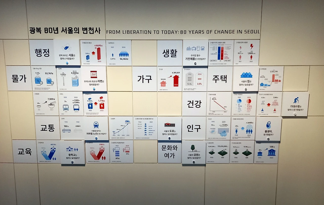 3부 공간은 서울에서의 행정, 물가, 교통, 가구, 인구 등에서의 변천사 관련 이야기를 인포그래픽으로 재미있게 표현한 파트와 광복 80주년을 맞아 시민들께서 광복 관련 물품을 기증한 이야기로 구성돼 있었습니다.