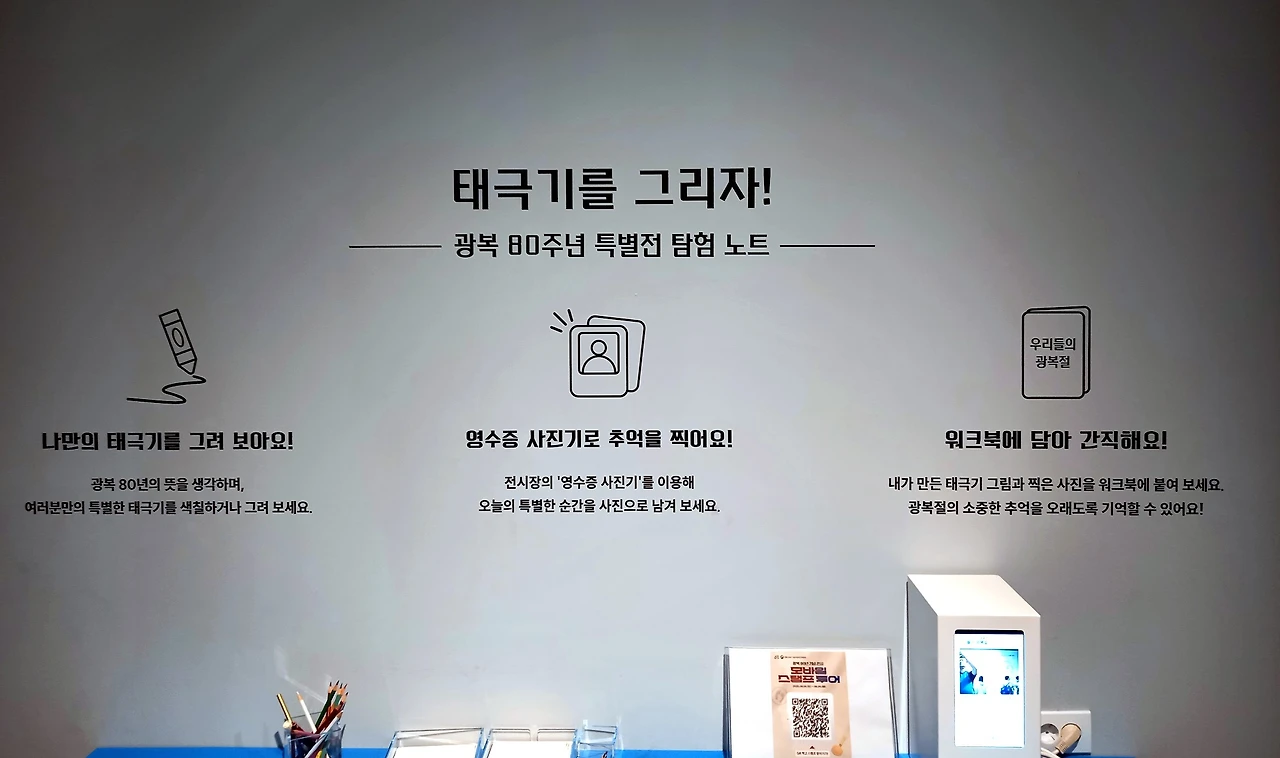 8월 9일부터 24일까지 광복 80년 기념 전시 6곳을 방문하여 3개 이상의 스탬프를 획득하면 선착순 7천 명에게 광복 80년 한정 굿즈 “기념 화폐”와 “독립운동가 키링”을 받으실 수가 있습니다! 바로 이 <우리들의 광복절> 특별전도 6곳의 전시 중 하나며, 태극기 그리기 테이블에 스탬프 큐알코드가 비치되어 있습니다. 당연히 놓치지 않았답니다.