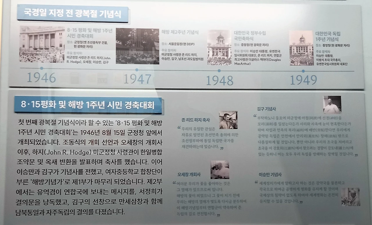 앞에서 말씀드린 것처럼, 역사적인 1945년 광복 직후의 모습 그리고 80년에 이르는 광복절 경축식의 역사와 변천사 등에 이르기까지. 새롭게 알게 된 내용이 너무너무 많았습니다. 학창 시절 제대로 공부를 안 했기 때문일 수도 있지만, 아마도 대부분은 교과서에서 제대로 배우지 못한 내용이었기 때문일 것입니다.