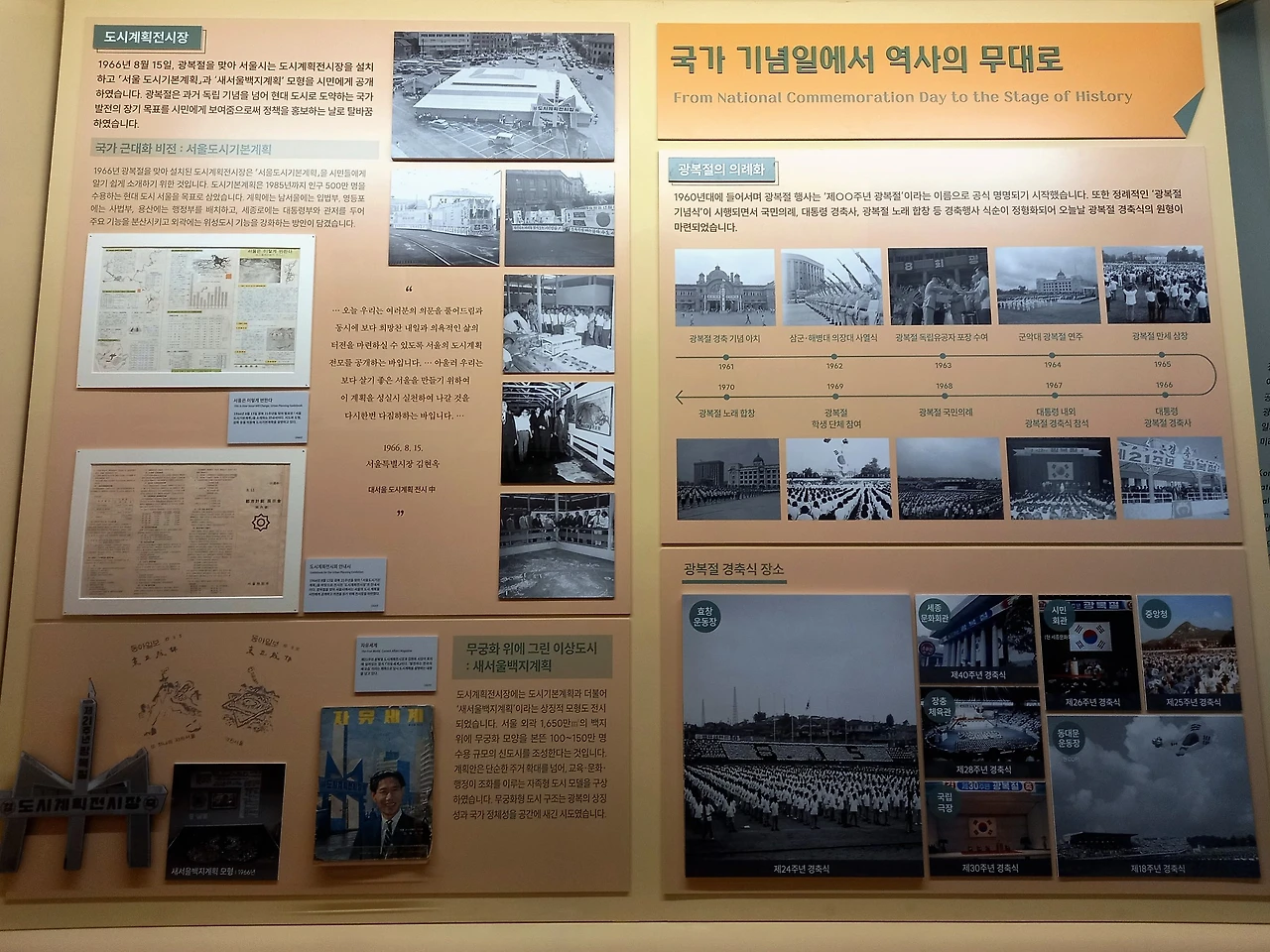 1960~70년대의 광복절은 정치적 통치 수단으로, 국가 정당성을 선전하는 목적으로 계속 기능했습니다. 1966년 광복절 날 서울시는 도시계획전시장을 설치해 「서울 도시기본계획」을 소개했고, 1974년 서울 지하철 1호선, 이에 앞서 19070년 남산 1호 터널, 1971년 퇴계로 지하차도 개통 등 각종 주요 시설물의 준공식 및 개통식이 광복절에 열렸더군요. 물론 정치적인 목적에 의한 것이겠지만, 광복절에 국가의 미래 비전과 국민에 희망찬 국가사업을 보여주는 그 자체는 나쁘지 않다고 생각합니다. 다만, 다른 의도는 없었으면 하고요.