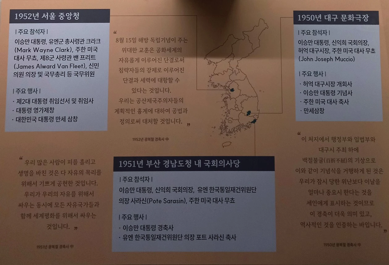 국경일로 지정된 후의 첫 광복절은 공교롭게도 6∙25 전쟁 중으로, 임시수도였던 대구 문화극장에서 51년에는 부산 경남도청 내 국회의사당, 52년에는 서울 중앙청에서 열렸답니다.