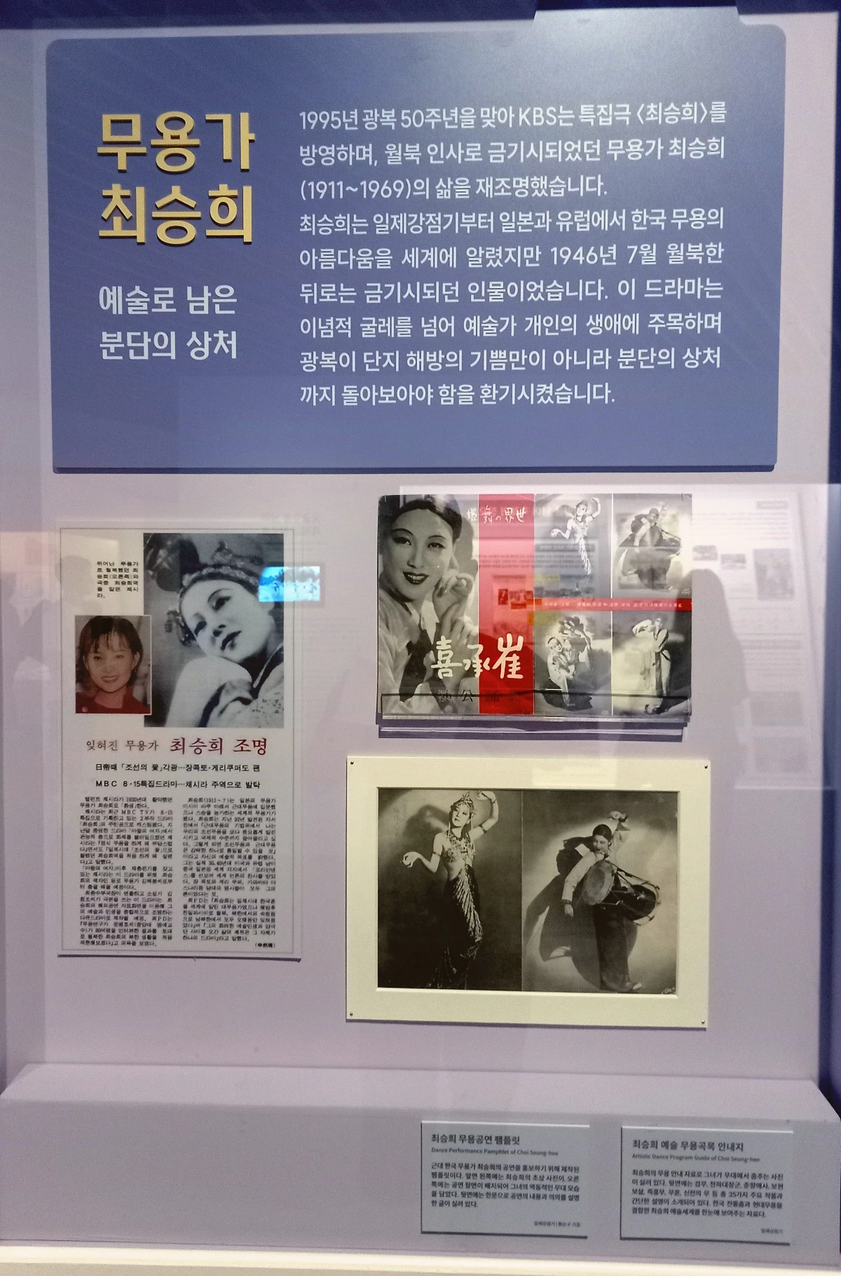 여기 전시 공간에서의 메인 조명 인물은 바로 역시 월북 인사로 금기시되었던 무용가 최승희입니다. 1995년 광복 50주년을 맞아 KBS에서 특집극 <최승희>를 방영하며 그 삶을 재조명했다네요. 제가 이 인물에 대해서는 찾아본 적이 있는데, 한국 무용을 세계에 알렸던 대한민국의 현대무용 시작으로 평가받는 전설적인 인물로 알고 있습니다. 월북한 뒤에는 결국엔 김일성에 의해 숙청당한 것으로 추정되고 있고요. 다만, 월북 외 그 이전 친일행적이 있다는 논란 있는 인물이라는 점은 전시에서는 안 나와 있었습니다.