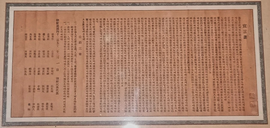 첨언이 크게 필요가 없는 유물이지요. 2만 2천 부를 인쇄해 배부했다는데 그 수치는 이번에 처음 알았습니다. 역사적으로 길이 남을 결과를 만든 3∙1 독립선언서를 보고 있노라니 그 인쇄물을 뿌리고 이후 만세 운동이 전국에 물결처럼 퍼진 당시 상황이 상상돼 마음이 뭉클했습니다.