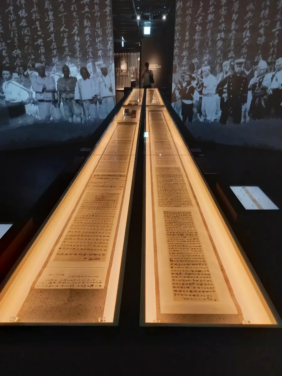 격문을 길게 나열한 모습은 장관이었습니다. 이에 더해 격문 끝에는 교과서에도 있고 매스컴에도 많이 노출돼 정말 유명한 사진이죠, 격문 글씨를 배경으로 한 "정미의병" 단체사진이 더해져 굉장히 웅장했습니다. 1부를 넘어 전체 전시 중 손꼽히는 하이라이트 지점이라 할 수 있겠습니다. 좋았던 것은 단순히 실물로 멋있게 나열된 원본을 보는 데서 그치는 것이 아니라, 터치스크린을 통해서 그 내용도 확인할 수 있었다는 것입니다.