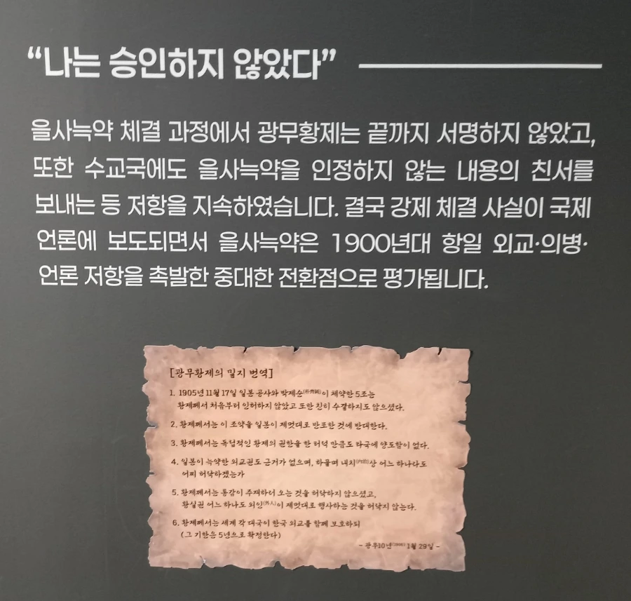 하지만 고종은 끝까지 서명하지 않았고, 수교국에도 을사늑약을 인정하지 않는 내용의 친서를 보내는 등 저항을 지속했습니다. "나는 승인하지 않았다" 제목의 전시물에서 이를 확인할 수 있었습니다. 을사늑약이 의사에 반해 강압적으로 체결됐다는 것이 다시금 깨달을 수 있었습니다. 그리고 제 속이 부글부글 끓더군요.