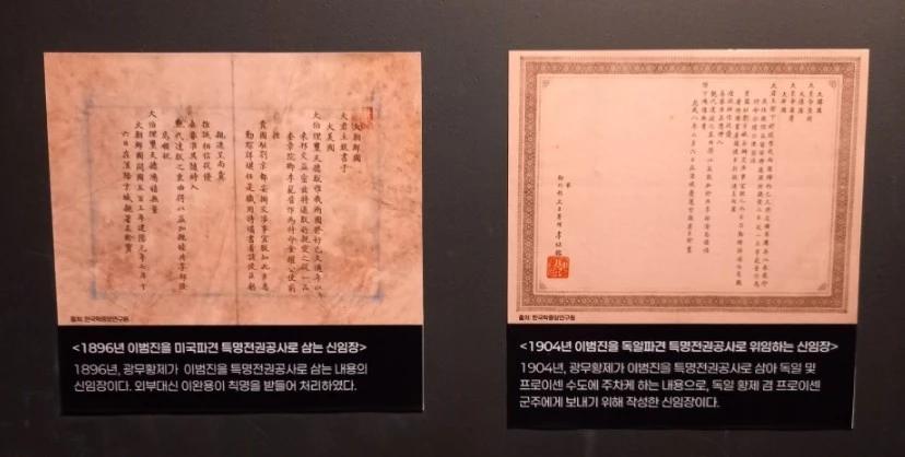 미사일록에 앞서 이범진을 미국 파견 특명전권공사로 삼는 임명장 및 독일 파견 특명전권공사로 위임하는 신임장도 볼 수 있었는데요. 1부 초입부터 고종과 명성황후의 신임을 받는 친러파의 중심인물로서 대한제국 대표적 외교관이자 독립운동가인 이범진에 대해 집중 조명했습니다. 아관파천 시기에 큰 역할을 했고 조선의 외교적 입지를 다지기 위해 애쓴 "이범진"이란 인물에 대해 새롭게 알게 된 것은 전시 관람의 소득 중 하나입니다. 1910년 경술국치에 항거하며 순국한 위대한 애국지사 이범진. 이런 인물을 그동안 모르고 있었다니, 부끄러웠습니다. 그래도 다행인 것은, 이러한 항일 유산 기록물 덕에 앞으로 많은 후손들이 알아가고 기억하게 될 것이라는 겁니다.