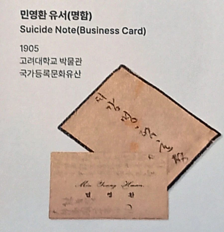 민영환이 을사늑약에 반대하며 순절한 직후 그의 옷깃 속에서 발견된 명함이다. 앞면에는 '육군부장정일품대 훈위 민영환', 뒷면에는 민영환의 이름이 한글과 영문으로 인쇄되어 있으며 그 위에 2천만 동포들에게 각성을 촉구하는 유서가 있다.