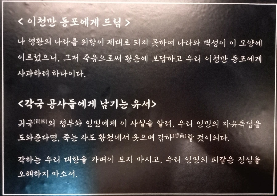 헤이그 특사 관련 내용은 우리가 교과서에서 배웠고 다들 잘 아시기에, 위 설명 사진과 함께, 1917년 3월 러시아에서 남긴 이상설의 유언으로 대신하겠습니다. 기필코 조국광복을 이루라는 말을 하시고 돌아가신 이상설 특사, 광복 후에는 그 혼으로 돌아오셨겠지요?