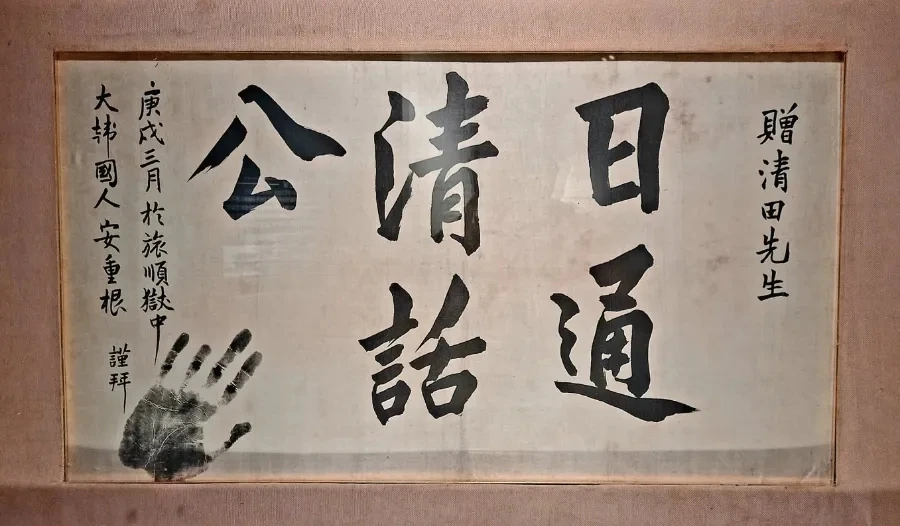 <일통청화공>은 1910년 3월 안중근 의사가 일본을 포용하여 소통해야 한다는 의미를 담은 유묵으로. 뤼순형무소 간수과장이었던 기요타에게 써준 것입니다. 뮤지컬 영웅에서도 이 장면이 나오기도 하는데요, 안중근 의사의 동양평화론 사상을 잘 나타냅니다.