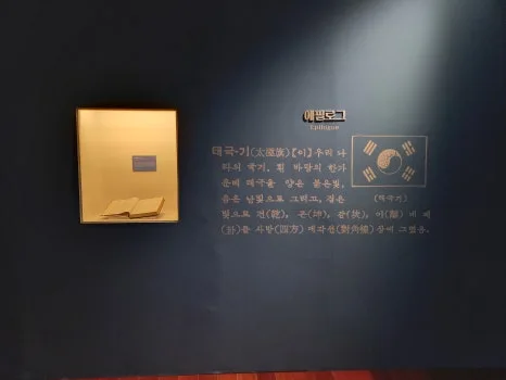 이 공간에서 가장 흥미로웠던 전시물은 외국 도서 속의 태극 문양과 태극기였습니다. 다른 전시물들은 우리가 그리고 새긴 것인데 반해 여기서는 외국에서 한 것이라는 점에서 남다르게 느껴졌습니다. 여기까지 본 태극기는 보시는 것처럼 태극 문양도 사괘의 위치 등도 조금씩 다르다는 것을 알 수가 있는데요. 현재의 통일된 태극기는, 광복 이후 1948년 대한민국 정부가 수립 이듬해인 1949년 10월 15일 [국기제작법고시]를 통해 확정되었습니다. 당시의 국기해설도 등 게시물을 통해 관련 문서를 확인할 수 있었습니다.