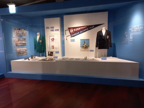 전시 한쪽에는 1948년 런던 올림픽에 참가한 대한민국 선수단의 단복과 당시 사진 및 관련 자료, 그리고 바로 옆 1988년 서울 올림픽의 단복과 마스코트 호돌이와 사진들이 함께 전시돼 있는데 역시나 이들 사진 속에서도 태극기는 함께 해 있더군요.