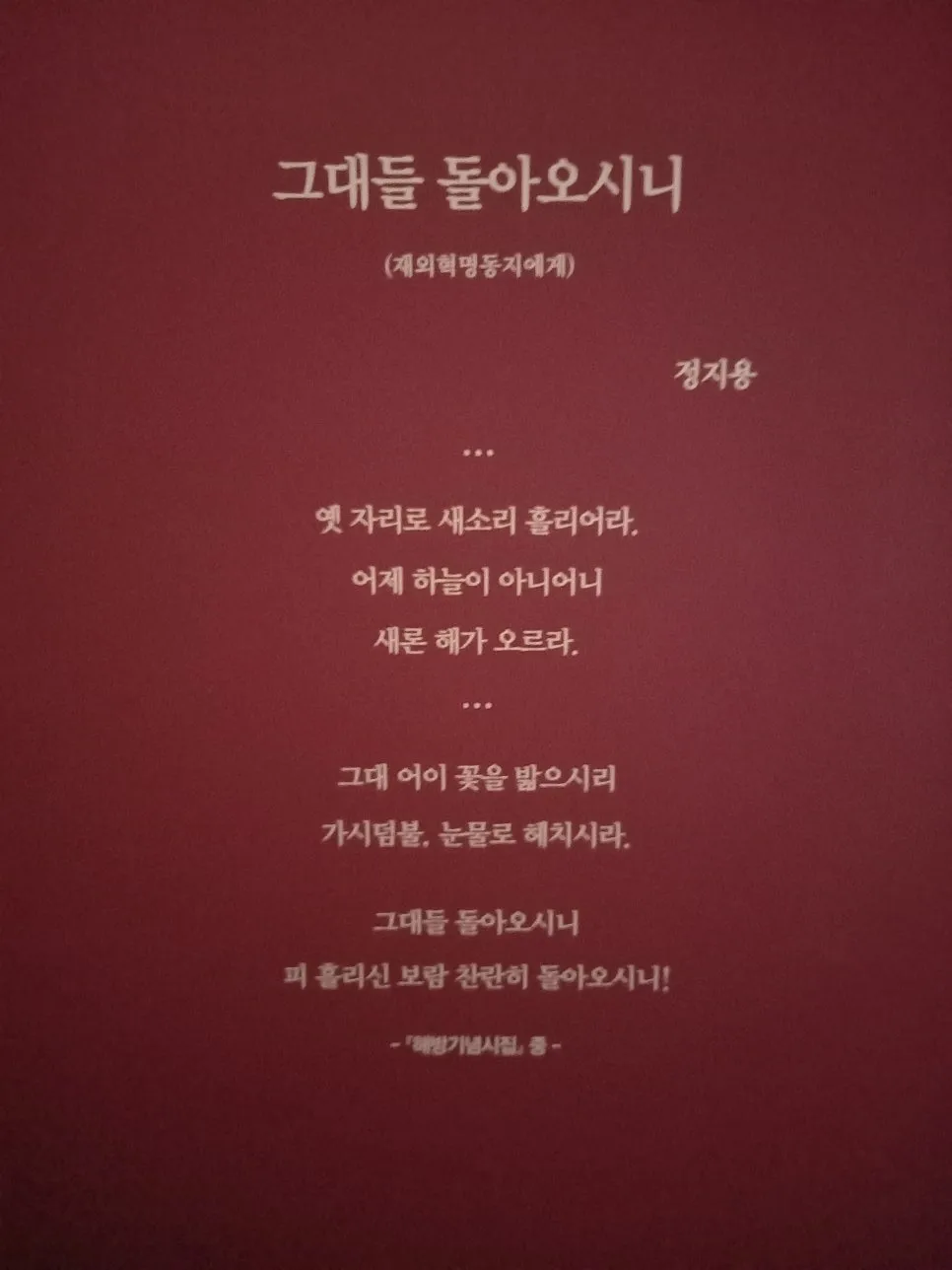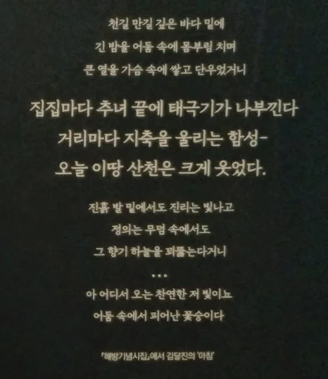 시집에 수록된 김달진의 <아침>에서 지축을 울릴 정도로 기쁨의 함성을 질렀고 이 땅 산천이 크게 웃었다고 표현한 부분이 예술이었습니다. 광복의 기쁨이 얼마나 컸는지 이 문장으로 조금은 가늠이 됐습니다. 또한, 집집마다 태극기가 나부낀다는 내용을 통해 기쁨에는 태극기가 함께 했다는 것도 확인할 수 있었습니다. 태극기는 이처럼 기쁨과 함께 했으며, 또 이후에 소개해 드릴 것처럼 슬픔에도 함께한 대한 국민에게는 떼려야 뗄 수 없는 상징물이네요. 해방기념시집을 통해 앞으로 펼쳐질 전시에 대한 기대감이 높아졌습니다.