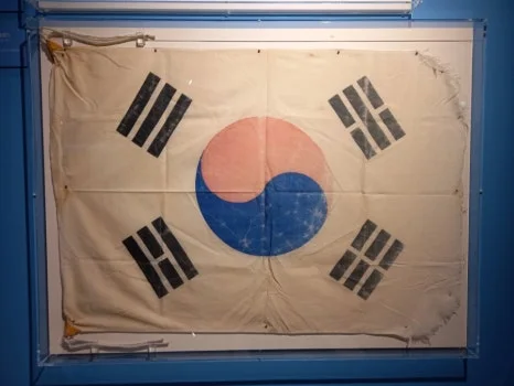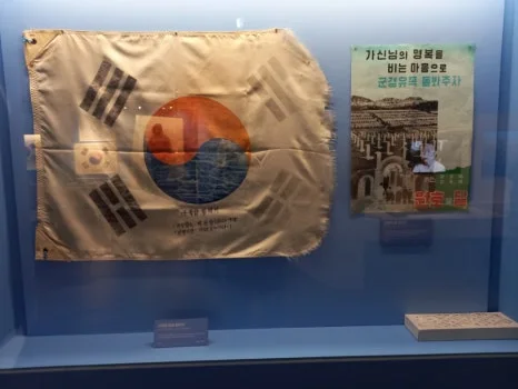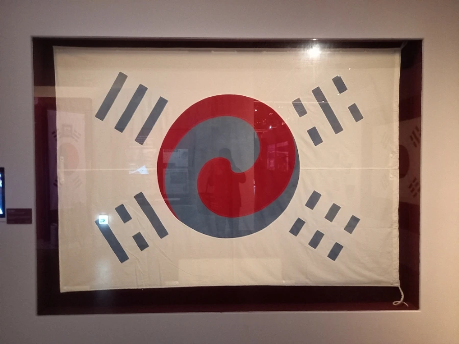 한국전쟁 당시 쓰였던 무운장구가 기재된 태극기가 한두 개가 아니었네요. 제가 보지 못했던 태극기가 있었던 것을 보면 말이죠. 전쟁에 참전하는 장병들이 조국 수호를 맹세하고 무운을 기원하는 의미에서 태극기에 각자 서명을 했다고 합니다. 독립 전쟁이 아닌 민족 간의 전쟁 때 태극기라 이를 보고 있노라면 마음이 아픕니다. 이 태극기를 보면서 한국에서 다시는 전쟁이 일어나서는 안 된다는 것과 어서 통일이 되었으면 좋겠다는 생각을 했습니다. 세 번째 구역에서는 1949년 공식적으로 통일했기 때문에서인지, 현재의 모습과 동일한 태극기들만이 보였습니다.