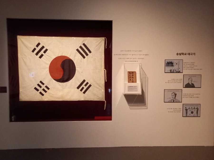 그 옆의 숭실학교 태극기도 7월에 갔던 특별전을 통해 알고 있던 태극기인데요. 그때는 축약된 태극기인데 반해 이번에는 실물 크기로 보니 확실히 다른 느낌이 들긴 했습니다. 1919년 3.1 운동 때 평양 숭실학교 학생들은 내렸던 태극기를 다시 내걸고 함께 만세를 외쳤습니다. 이때 숭실학교 사무엘 모펫 교장은 일제에 압수될 것을 우려해 잘 숨겨 보관하다 미국으로 돌아가는 자신의 아들 제임스 모펫에게 잘 간직해 줄 것을 당부했고, 1974년 9월 아들은 아버지의 유언대로 한국에 태극기를 기증하여 이렇게 우리들과 만날 수 있게 됐습니다.