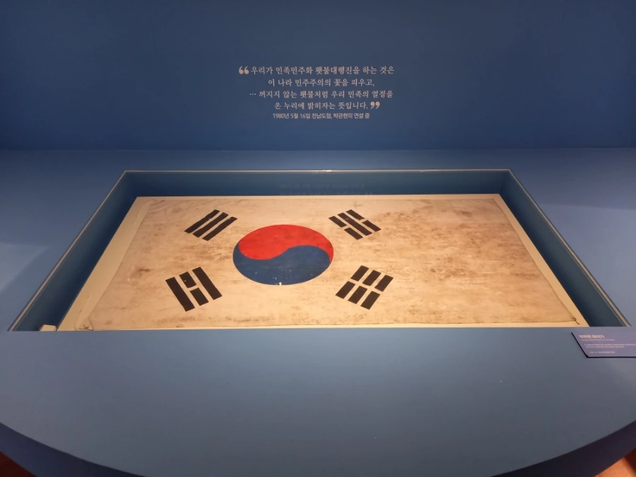 대한민국 임시의정원 태극기와 마찬가지로 별도 공간에 특별히 마련된 "박관현 태극기"의 주인공 박관현 열사는 1980년 5.18 민주화 운동 때 전남대 학생회장이었으며, 도피 생활 끝에 1982년 체포돼 옥살이 중 단식투쟁을 벌였고 이후 사망했습니다. 위 태극기는 박관현 열사의 관을 덮은 태극기로 1997년 공개되었습니다. 민주화 운동 때도 함께 했던 태극기입니다. 무운장구 태극기를 봤을 때와 비슷한 감정이 들었는데요. 다시는 이러한 희생이 일어나지 않았으면 좋겠습니다.