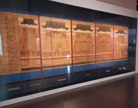 대형 병풍 전시가 제 눈길을 사로잡았는데요. 조선 제24대 헌종의 후궁 효정성황후(1831~1903)의 71세를 기념한 궁중 행사 모습을 담은 ‘진찬도’인데요. 처음에는 '태극기랑 무슨 상관이지?'라는 생각을 했습니다. 그런데 가장 우측 병풍을 자세히 보니 태극기 깃발이 보이더라고요. 태극기가 국가 행사에서 이렇게 쓰였음을 보여주는 중요한 의의가 있는 그림이었습니다.