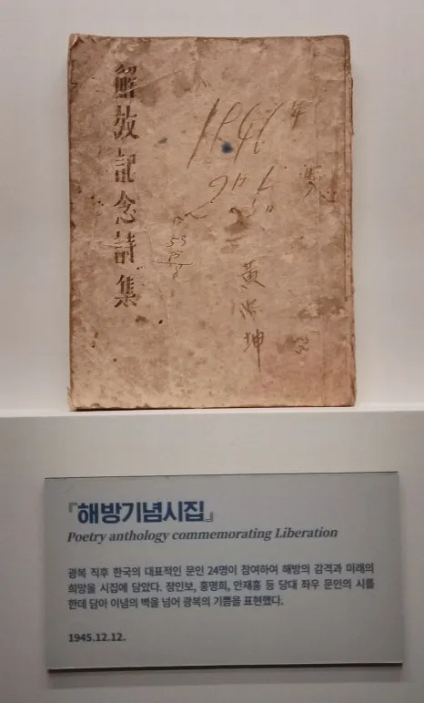 전시는 시간의 흐름에 따라 <1. 붉고 푸른 깃발 높이 들고>, <2. 그대들 돌아오시니>, <3. 기쁨과 슬픔, 희망을 담아>의 총 3가지 구역으로 모두 16개의 태극기와 그 시대의 다양한 모습 등을 담은 전시물로 구성돼 있었습니다. 본격 전시 전에는 "전시를 열며"를 통해 이번 특별전에 대한 취지와 전하고자 하는 메시지와 바람을 담은 소개와 함께, 80주년 특별전답게 광복을 맞이한 1945년 그해 12월 12일에 발간한 『해방기념시집』 이 전시돼 있었습니다. 광복 직후 정인보, 홍명희, 안재홍 등 당대의 대표 문인 24명이 해방의 감격과 기쁨, 미래의 희망을 담았다고 하네요.