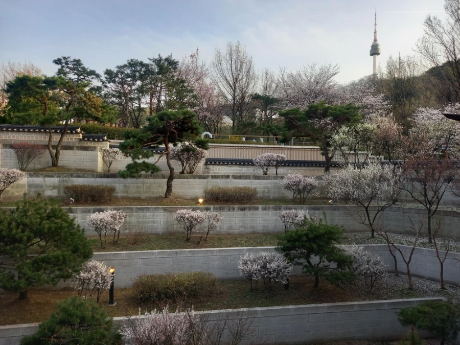 특히 이곳의 명물뷰는 바로 선큰가든 "침상원"입니다. 벚꽃 시즌의 침상원은 저도 처음이었는데 비현실적인 그림 같은 풍경이더라고요. 괜히 외국인들이 많이 찾는 곳이 아니었습니다. 국악당 공연 보러 오신다면 혹은 남산한옥마을 방문하신다면 이 뷰를 절대 놓치지 마시고, 티타임의 여유도 즐겨보시길 바랍니다.
