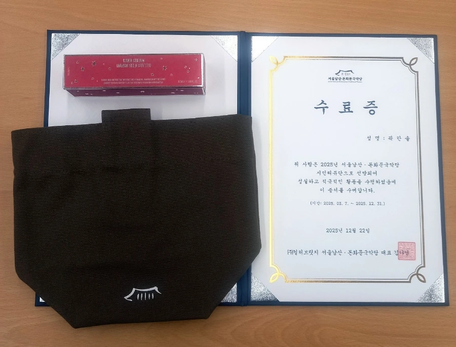 그 결과 총 10회의 리뷰글이 나왔고, 해단식에서 수료증까지 받게 돼 뿌듯하더라고요! 서울남산돈화문국악당에서의 공연 만족도는 평균적으로 높습니다. 전통공연은 지루하다는 막연하고도 근거 없는 편견이 있었는데 리뷰단 활동을 통해 완벽히 깨뜨릴 수 있었습니다.