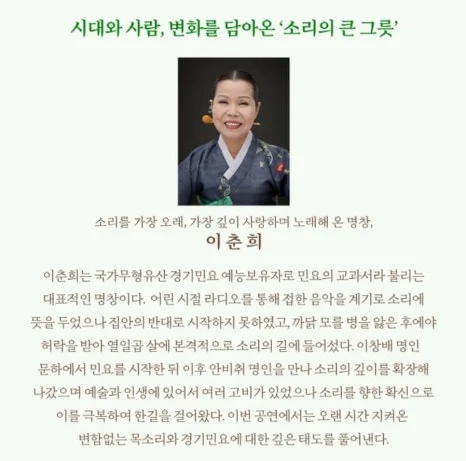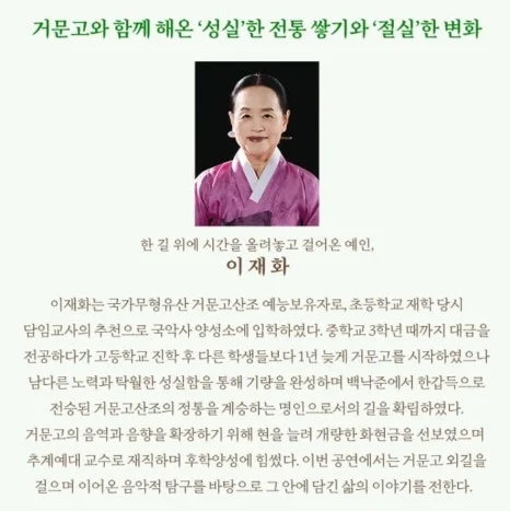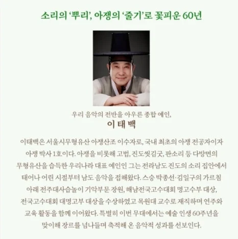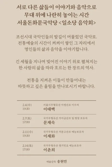 * 공연 소개 : 전통예술의 시간이 켜켜이 쌓인 그 자리에서 명인들의 삶과 음악을 이야기합니다. 긴 세월을 지나며 빚어진 이야기 위로 펼쳐지는 한 사람의 삶을 따라 흐르는 한 장르의 역사. 전통을 지켜온 이들이 만들어내는 따뜻하고 깊은 울림을 만나보시기 바랍니다