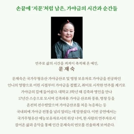문재숙은 국가무형유산 가야금산조 및 병창 보유자로 가야금을 전공하던 언니의 영향으로 어린 시절부터 가야금을 접했고, 취미로 시작한 연주를 계기로 가야금의 길에 들어섰다. 대학교 3학년 때 김죽파 명인을 만나 17년간 스승으로 모시며 김죽파류 가야금 산조와 풍류, 병창 등을 온전히 전수받았으며 가야금산조를 처음 녹음하는 등 국내외에 가야금 전통을 널리 알리는 데 앞장섰다. 이번 공연에서는 국가무형유산 예능보유자로서의 위상 너머, 한 사람의 연주자로서 걸어온 삶과 음악을 통해 인간 문재숙의 면모를 진솔하게 보여준다.