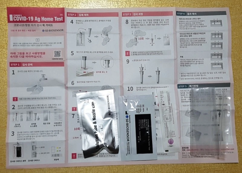 키트는 '검사용 디바이스', '용액통'과 '노즐캡', '멸균 면봉', 그리고 '사용설명서'로 구성돼 있었다.