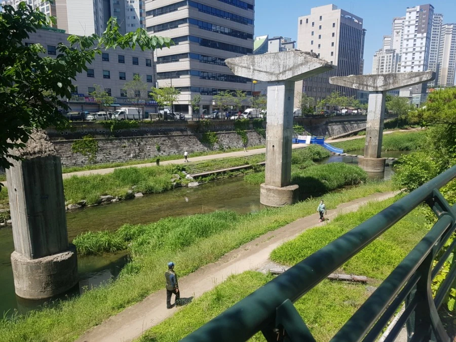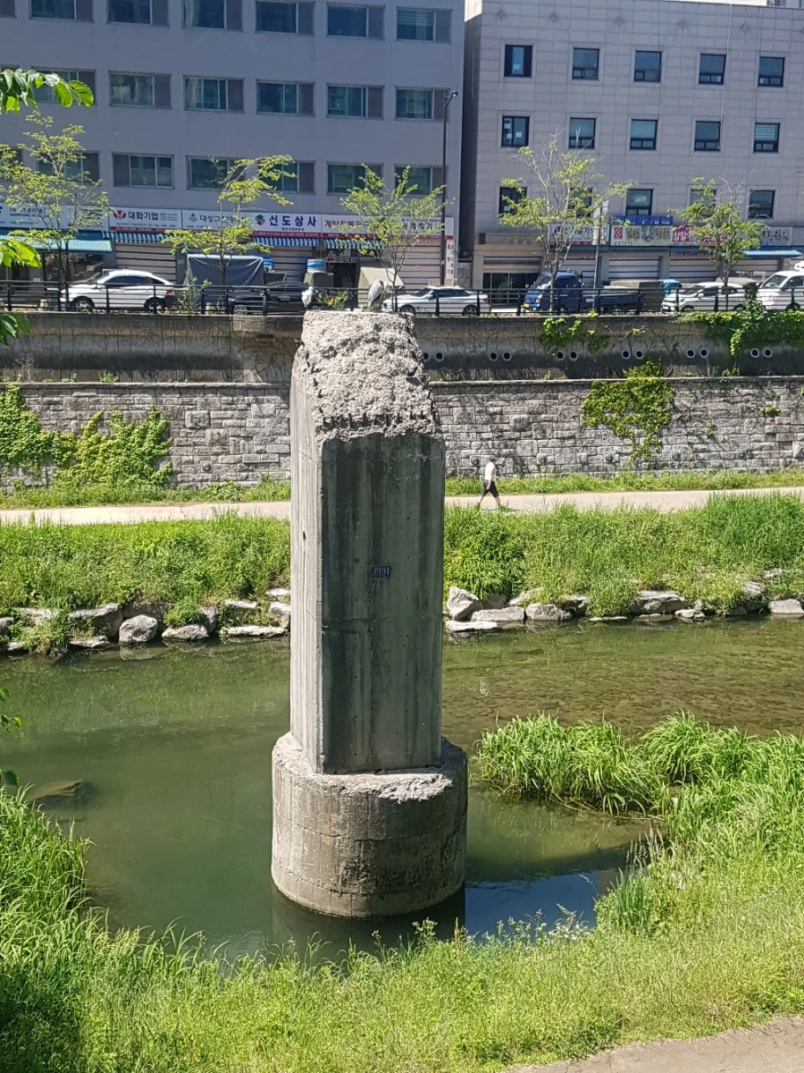 복구공사에서 청계천을 덮고 있는 다리를 철거하는 과정에서 이렇게 교각 3개를 남겨 놓았는데, 서울미래유산으로 지정돼 있다. 개인적으로 이렇게 그 시대의 흔적을 남기는 것은 바람직하다는 의견이다.
