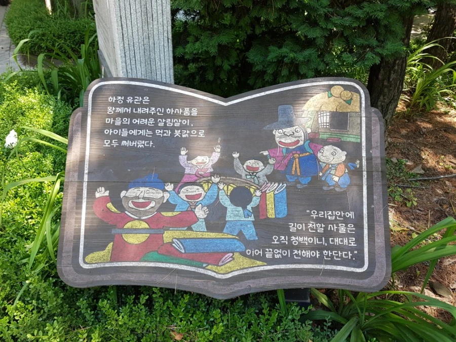 유관 선생의 청렴한 공직생활을 본받기 위해 서울시에서는 2009년부터 하정 청백리상을 수여하고 있다고 한다. 공원에는 그의 청렴한 일화를 담은 이야기 게시판도 찾아볼 수 있었다. 하정 유관 선생의 그 청렴한 삶을 나도 본받으며 살도록 노력하겠다.