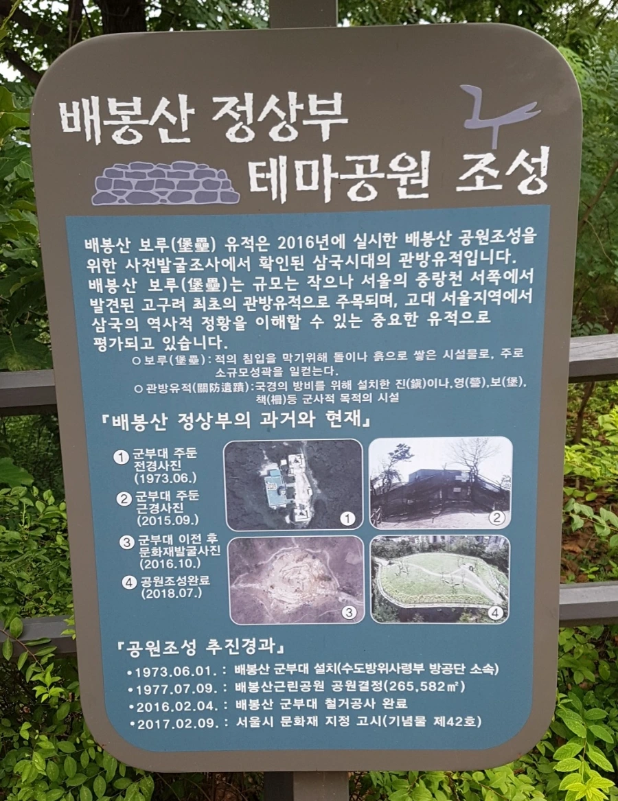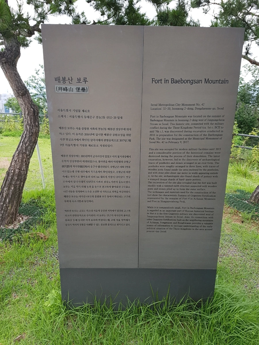 또, 이곳은 2015년까지 군부대가 있던 자리로, 부대가 철거되는 과정에서 고구려의 관방유적 배봉산 보루가 발견되었다고 한다. 비록 규모는 작지만 이곳이 매우 중요한 곳이었음을 알게 해주는 흔적이란다. 터 자리에 비석을 세운 것과 마찬가지로, 이렇게 역사적 흔적을 보존해 둔 것은 정말 잘했다고 생각한다. 그냥 철거했으면 배봉산 보루가 있었다는 사실은 널리 알려지지는 않았을 테니까.