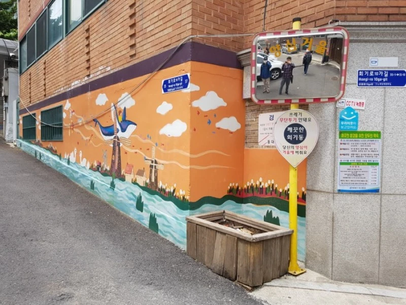 “회기동 안녕마을”은 얼핏 보기엔 여느 벽화마을과 다르지 않아 보이지만, 2013년 서울시 범죄예방환경디자인(CPTED, 셉테드) 사업을 통해 새롭게 조성된 곳이다. 그래서 이 골목길에는 양심거울, LED 가로등, 비상벨 등 안전 관련 장치들이 곳곳에 있었고, 이로 인해 범죄도 줄어들었다고 한다.