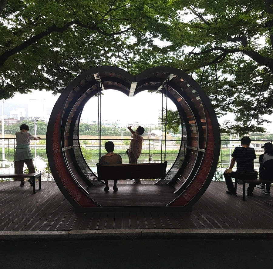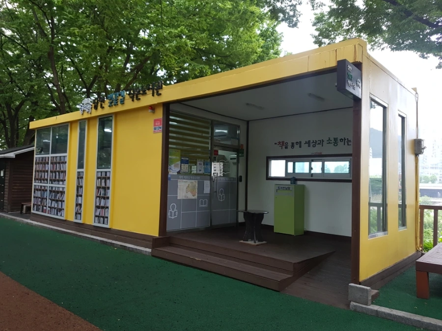 책을 볼 수 있는 장소는 북카페 말고도 또 있다. 이는 장평교와 장안교 중간 지점에 있는 "장안 벚꽃길 작은도서관"이다. 도서 대여는 안되고 열람만 가능했던 북카페와는 달리 작은도서관은 말 그대로 도서관이기에 당연히 1인 5권, 2주 동안 도서 대여가 가능하다. 책을 빌린 직후 바로 우측의 버섯 모양 의자에서 책을 읽어도 좋을 듯했다.
