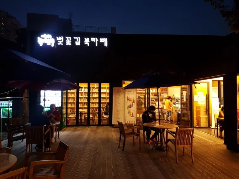 2020년 개관한 "벚꽃길 북카페"는 장평교가 다다르기 전에 볼 수가 있다. 내부에 진열된 책을 꺼내어 보면서 동시에 카페의 음료도 마실 수가 있는 곳이다. 참 예쁘게 잘 지었다. 중랑천 산책길의 작은 랜드마크로서 오래도록 사랑받을 것이라는 생각이 들었다.