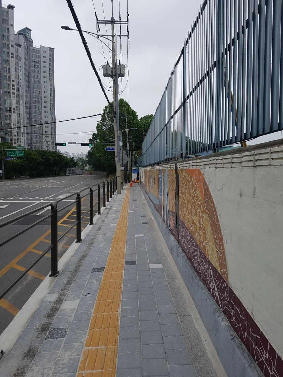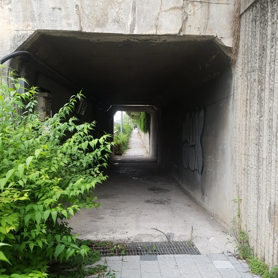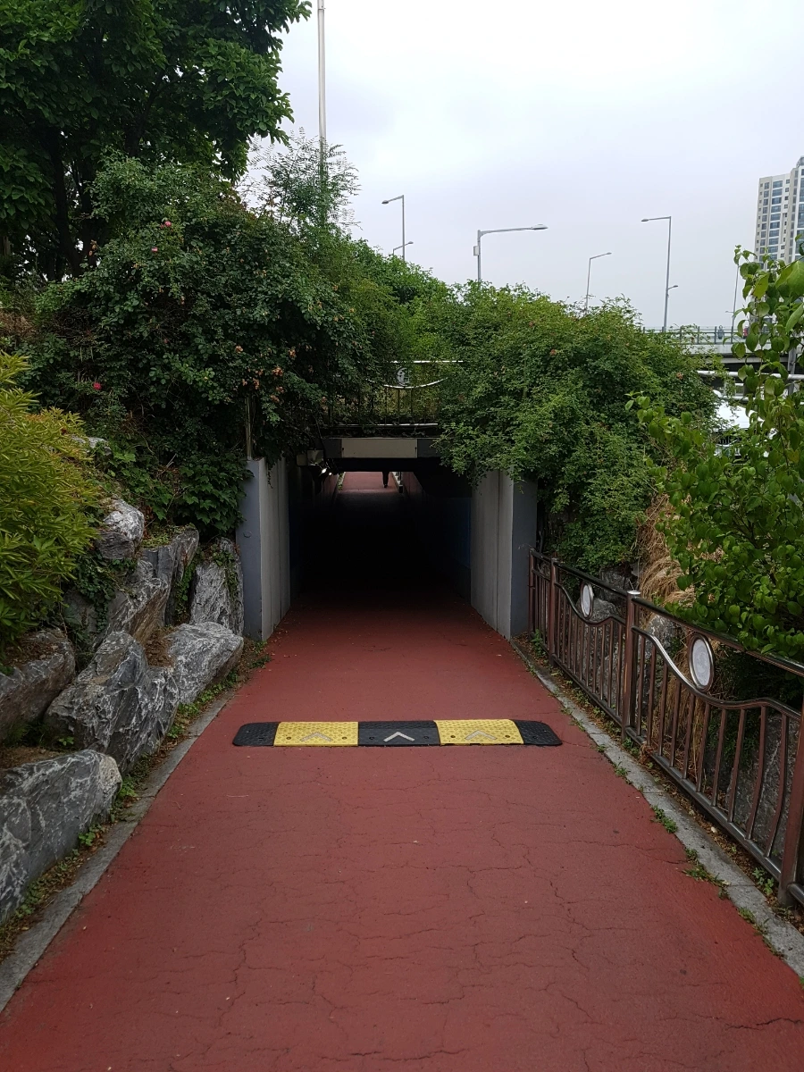 장평교에서 장안교 사이에는 벽화 담벼락 길이, 장안교에서 겸재교로 가는 사이에는 지하차도를 연상케 하는 개성 넘치는 길이 있다. 비슷한 산책로 길을 계속 가면 지루할 수도 있는데 이러한 교량과 교량 사이의 이색적인 길이 중간에 있어 걷기의 재미를 더해주었다. 개성 있는 길을 지나니 겸재교가 등장했다.