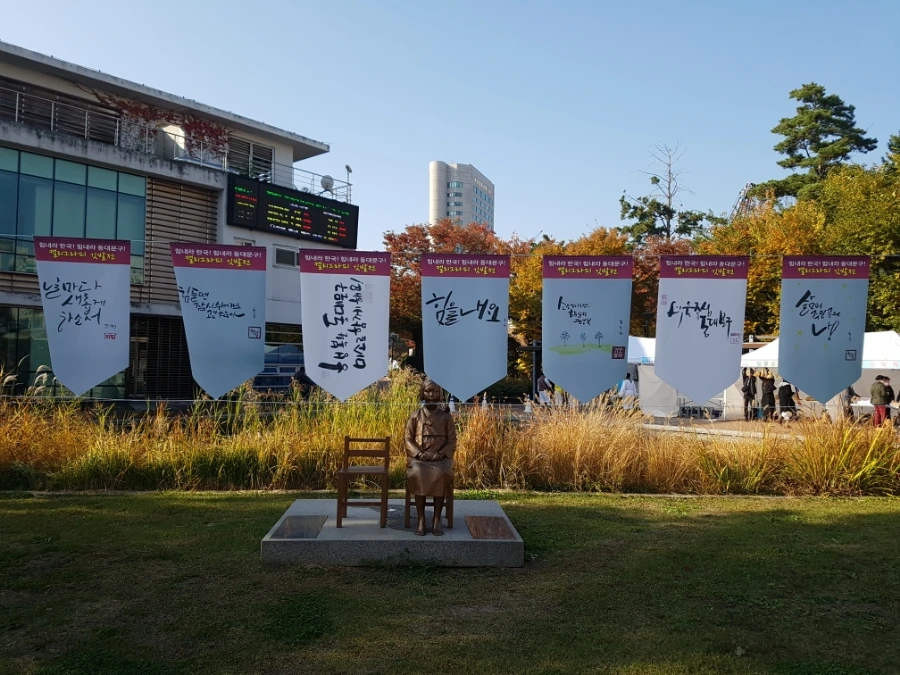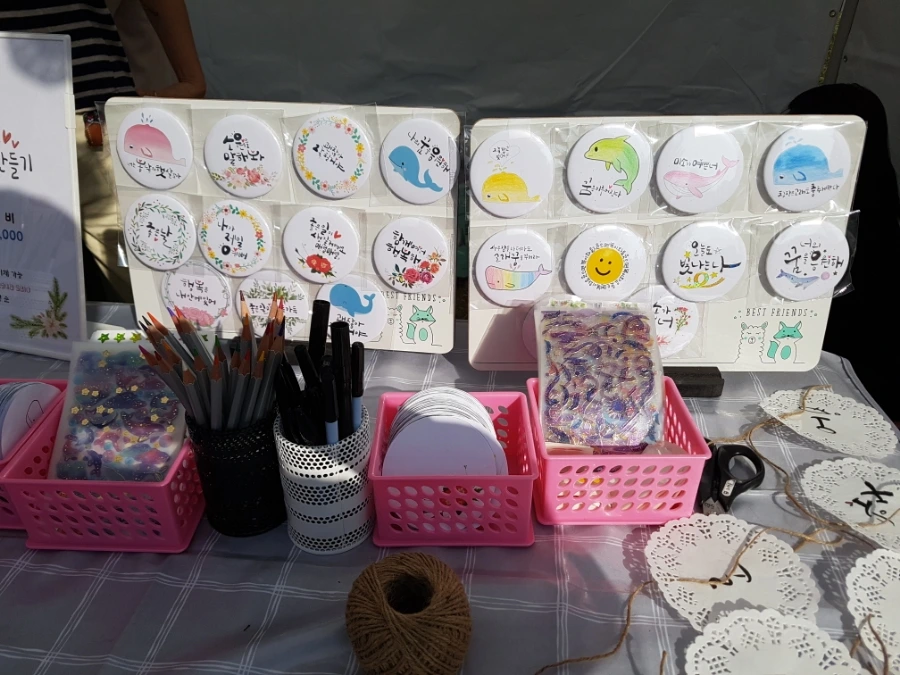 축제 장소인 용두근린공원에 들어서자, 캘라그라피 깃발전이 눈에 들어왔다. 깃발에 적힌 "힘들면 잠시 쉬어가도 괜찮아", "힘을 내요", "삶의 주인공은 나", "행복한 동대문구 미소로 함께해요!" 등의 문구를 보니 정말 힘이 났고 위로가 되더라.