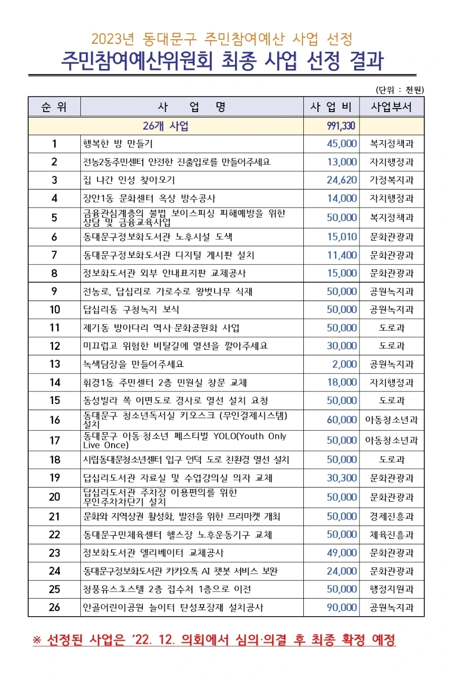 즉, 1년 안에 마칠 수 있는 우리 지역 및 생활과 밀접한 소규모 사업이 주민참여예산 사업의 대상이다. 당해 사업에 선정되면, 내년도 예산에 편성돼 사업이 시행된다.