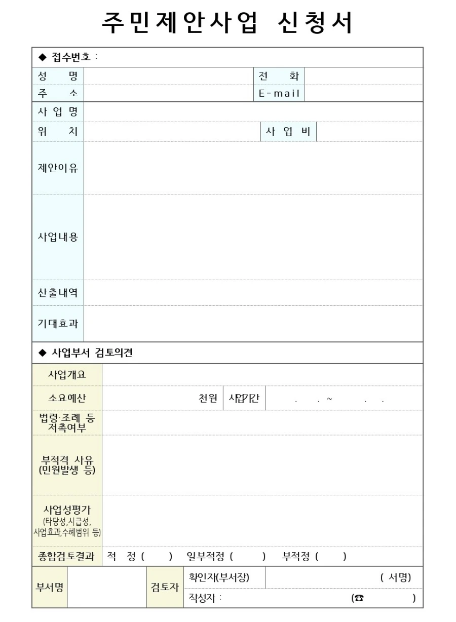 사업부서 검토의견 란이 있었는데, 이는 해당 사업의 주관부서에서 작성하는 것이기에 주민들은 작성하지 않아도 된다. 하지만, “역지사지” 사자성어처럼, 시행 사업 부서의 입장에서 이 사업이 시행할 만한 것인가 하는 생각을 가져보는 것은 사업 채택을 위해서는 매우 중요할 것으로 생각된다. 신청서 작성 시 사업부서의 입장에서 이 사업으로 인해 민원발생 등 부적격 사유는 없는지, 사업 효과와 수혜 범위는 적정한지를 염두에 두길 바란다.