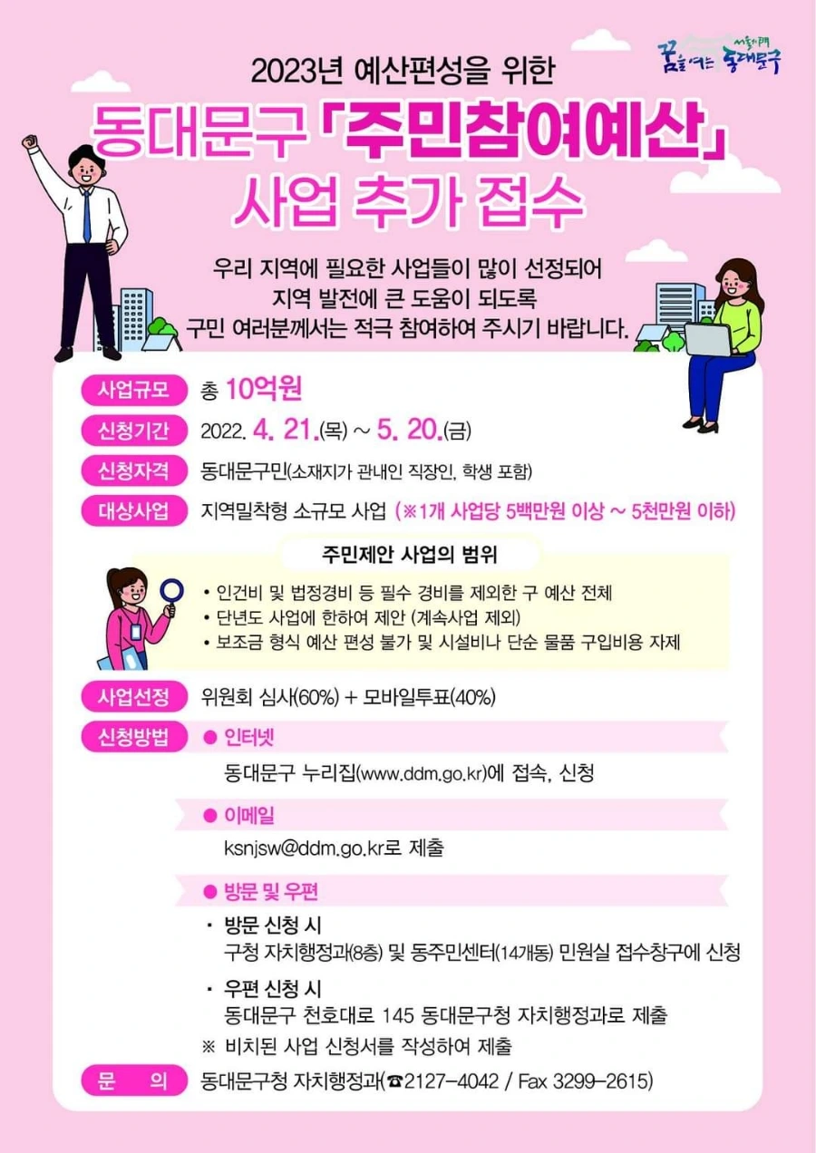 동대문구의 경우에는 3월 21일부터 4월 20일까지 한 달간 주민참여예산 사업을 접수했다. 홈페이지에서 공고 여부를 확인할 수 있고, 지역 내 주요 지점에 게시된 현수막 등 홍보물을 통해서도 확인이 가능하다. 그런데 동대문구에서는 최초 신청 기간에서 한 달 더 연장해 추가 접수를 받던데, 아마도 참여율이 저조하였기 때문이지 않았을까?