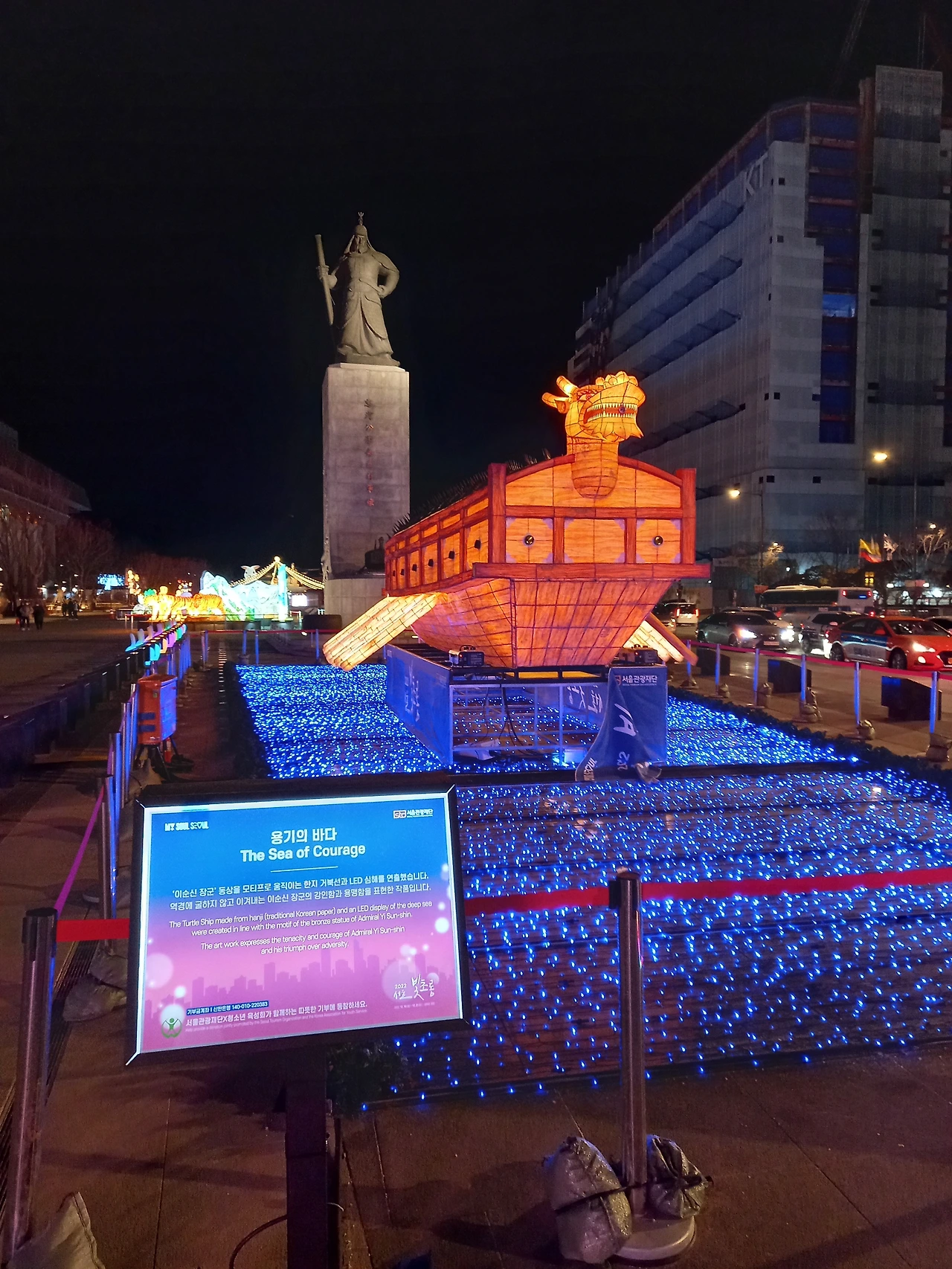 먼저 이순신 장군 동상 앞에 한지 거북선과 LED 심해를 연출한 "용기의 바다"라는 작품이 전시돼 있었다. 그 둘레에는 이순신 장군의 해전에 관련된 내용이 담긴 돌들이 쭉 놓여 있었다. 너무 춥지만 않았더라도 하나하나 읽어봤을 텐데.