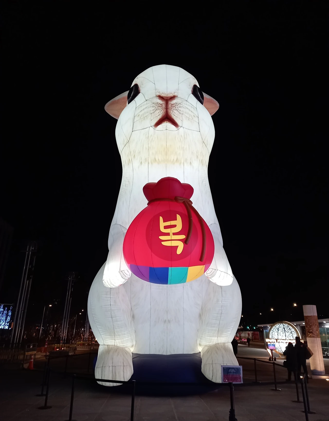 플리마켓을 지나서는 온라인 및 뉴스에서 본 적이 있어 눈에 익숙한 복주머니를 안고 있는 대형 복토끼 작품이 보였다. 그 가기 전 좌측 편에는 인증샷 이벤트 부스가 있더라. 플리마켓 행사장 가운데 위치한 복주머니와 복토끼 사진을 인스타그램에 해시태그와 함께 게시하고, 서울빛초롱축제 공식 인스타그램을 팔로우하면 경품을 주는 이벤트였다.