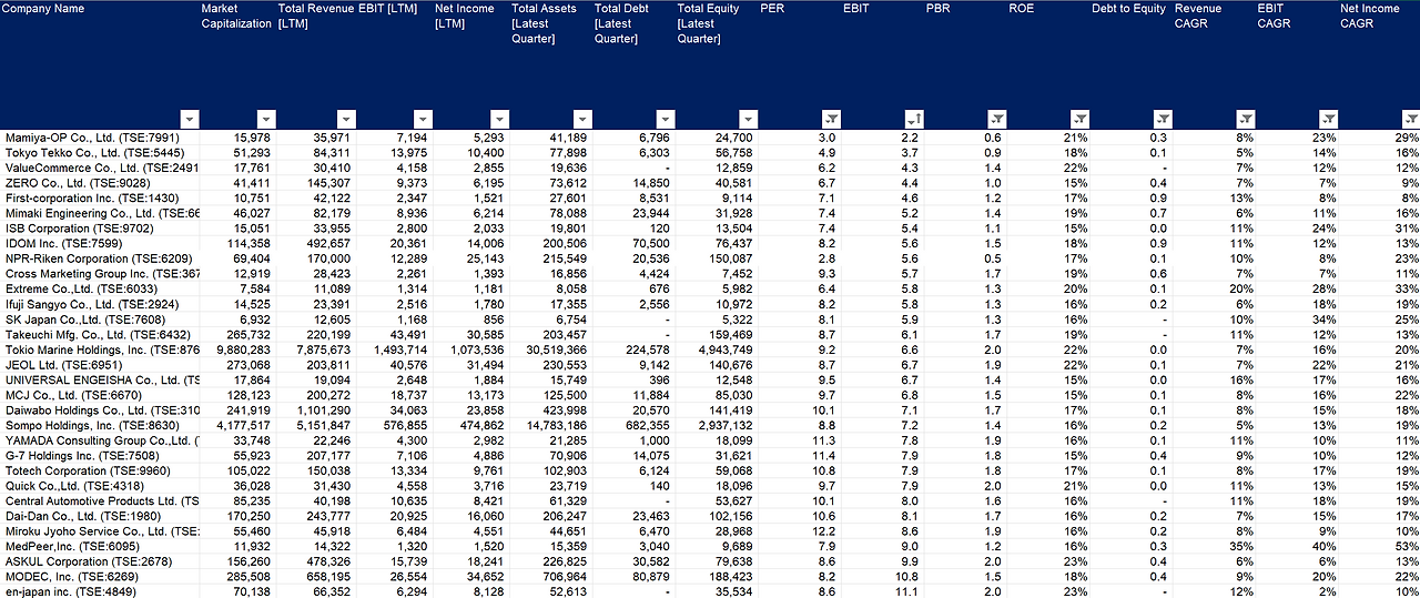 기업을 발굴할 때 나는 말 그대로 노가다에 가까운 방식으로 접근한다. 나는 주로 미국과 일본 시장에 상장된 기업들을 투자 대상으로 삼는다. 미국에는 다양한 거래소를 합쳐 약 1만 개 가까운 종목이 존재하고, 일본에는 4천 개를 조금 넘는 종목이 상장되어 있다. 이 수많은 기업들 중에서 기회를 찾기 위해, 나는 전수조사에 가까운 스크리닝을 매 분기마다 반복한다.