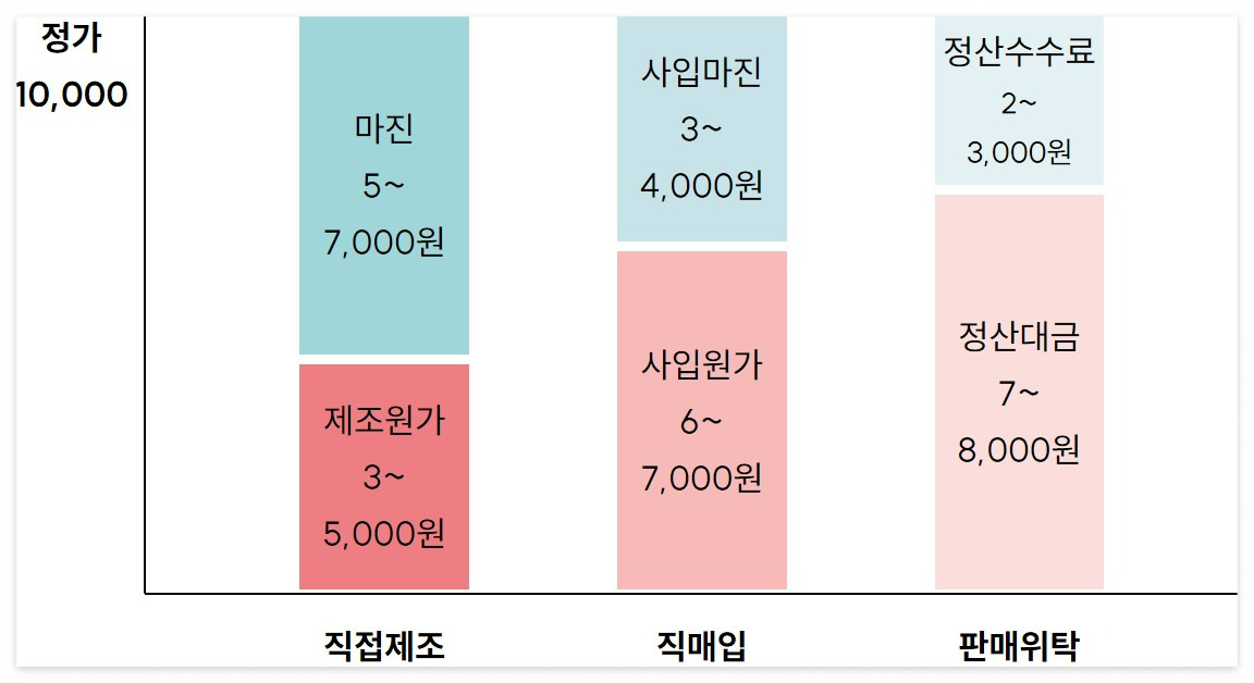 아래 Figure2는 직접제조, 사입, 위탁판매 시의 원가 구조를 보여드리기 위해 제가 대략 그린 그래프 입니다. 주의할 것은, 직관적인 이해를 위해 대략의 숫자를 기재하긴 했으나, 중요한 것은 상대적인 차이이지 이 숫자를 그대로 이해하지는 말라는 것입니다. 그리고, 여기에 기재한 '마진 또는 수수료'는 제품을 정가 그대로 판매했을 때 얻을 수 있는 이익이라, 업계에서는 이 마진을 계약 마진 또는 페이셜 마진(facial margin)이라 칭하는데, 대부분의 가격은 크고 작은 프로모션이 반영되기 때문에 실질적인 마진은 이보다 많이 낮아진다는 점도 참고해 주세요.