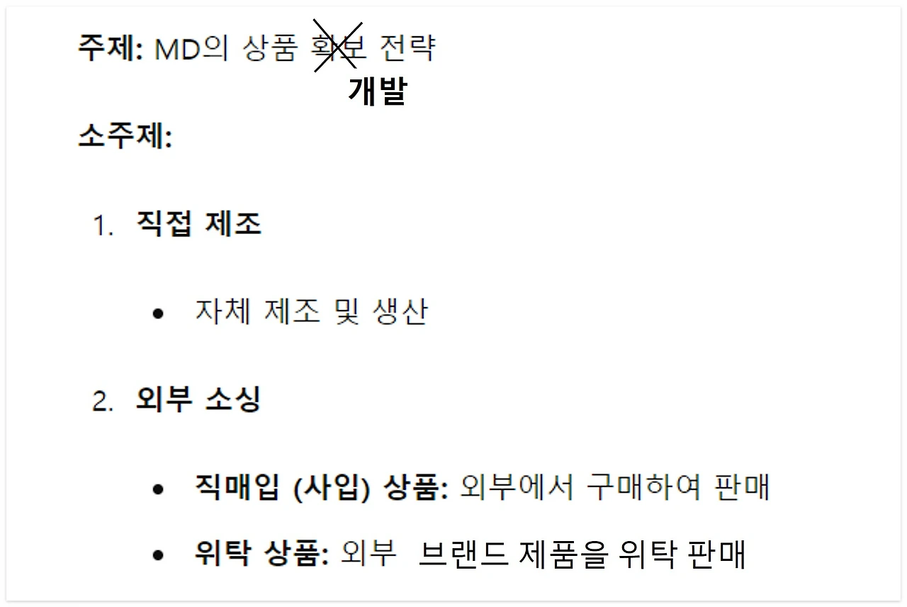 MD의 상품 개발(확보) 방법은 크게 1.직접 제조(OEM, ODM 포함)와 2.외부 소싱을 들 수 있고, 외부 소싱은 다시 직매입(사입)과 판매 위탁으로 나눠볼 수 있습니다. 여담이지만, 이 챕터의 제목을 정하는 데에서부터 약간 제동이 걸렸는데요. GPT에게 제목 의뢰를 했더니, 자꾸 소싱, 제조, 확보를 체계 없이 언급해서, 기본 정의 체크와 함께 하이어라키를 정리해 보게 시켰어요. 특히, 그동안 저도 대충 사용했던 확보, 조달(procuremet)와 소싱(sourcing)의 의미에 대해 체크해 보는 시간을 가졌답니다.