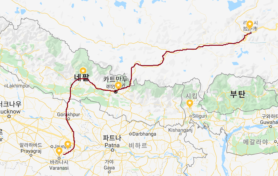 원래 생각하던 루트(라싸-카트만두-포카라-바라나시). 1일당 23만원짜리 티베트 투어를 할 수는 없었다.