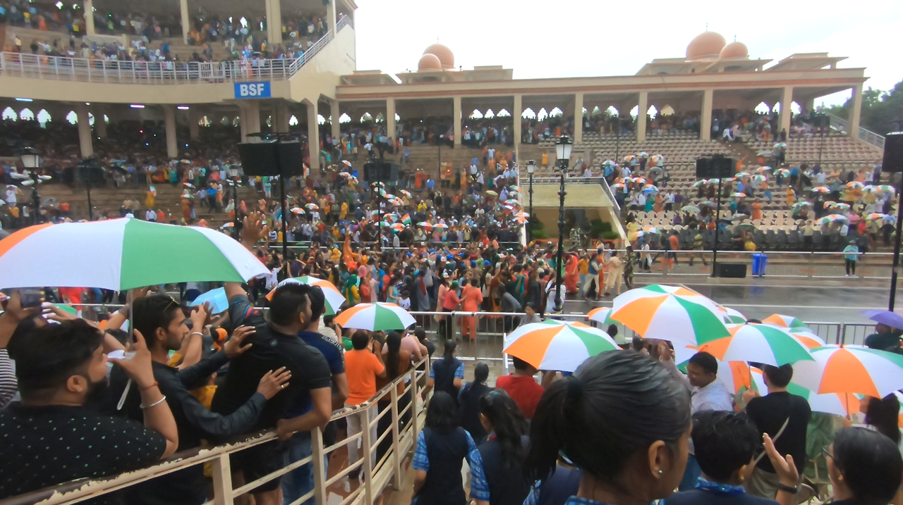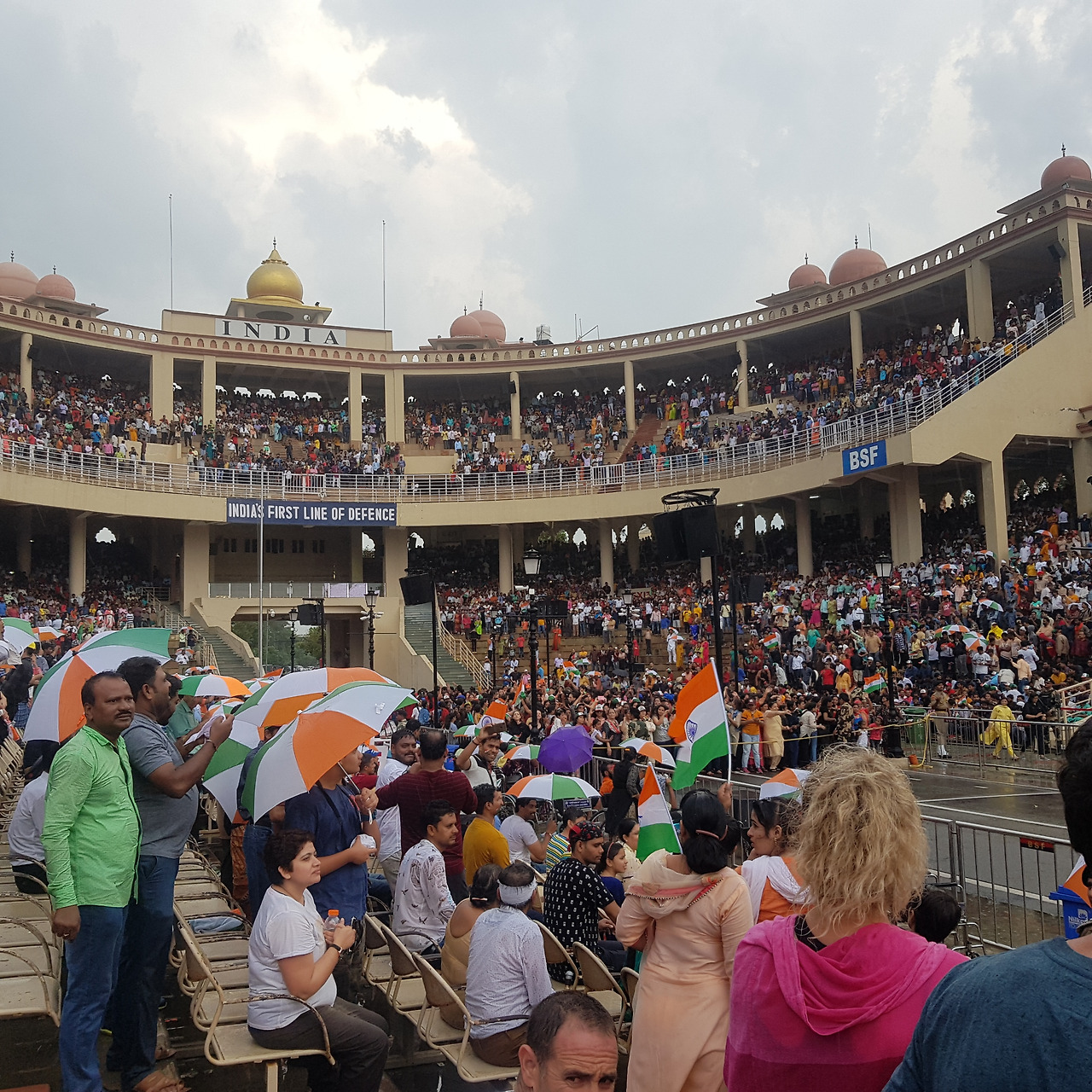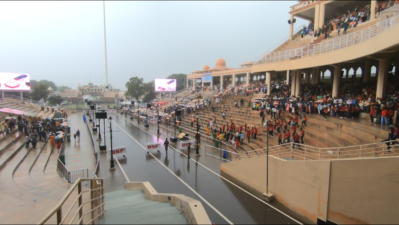 하기식 장소는 스포츠 경기장 같다. 국경의 문을 중심으로 도로가 뻗어있고 그 주변을 양국의 관중석이 둘러싸고 있다. 인도의 관중석은 2단이다. 거대전광판도 두개나 있다. 야구장에서나 보던 설계다. 건너편 파키스탄 관중석은 조촐하게 1단이다. 외국인 자리는 파키스탄과 가까운 곳이다. 국력을 과시하려는 인도의 선전이다.