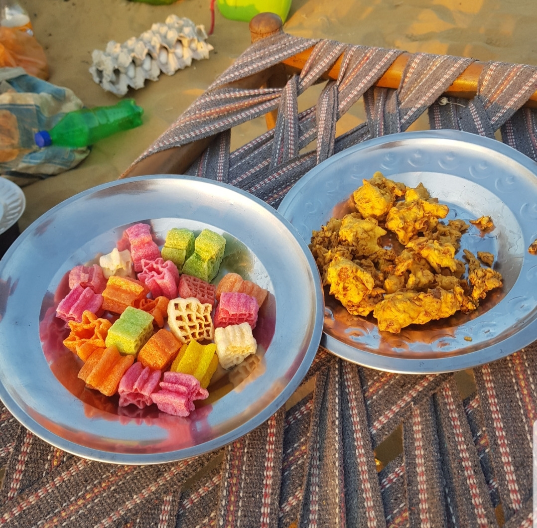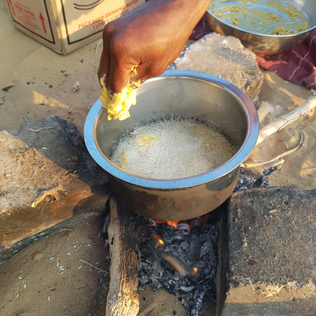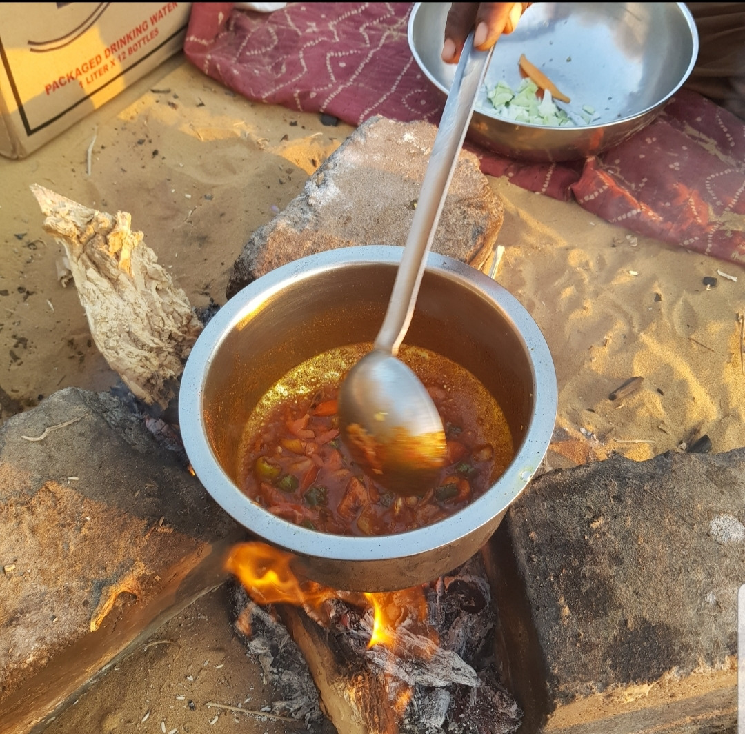 짐을 정리하자마자 수반은 요리를 한다. 큰돌 몇개를 괴어 냄비를 올리고 폐지를 불쏘시개로 장작에 불을 붙인다. 화력이 일정하지 않으니 물이든 기름이든 끓는데 한세월이다. 저녁 메뉴는 파코라(인도식 야채튀김), 두 종류의 커리, 짜파티(인도식 빵), 냄비밥, 튀긴 과자다. 스토브(?)도 하나고, 도마도 없고, 싱크대도 없는 환경이니 시간은 오래 걸리지만 하나둘 요리가 완성된다. 도마도 없이 양파를 왼손에 쥔채 장난감 같은 칼로 칼질을 하는게 경이롭다. 같이 먹자고 말해도 수반은 요리가 남았다며 한사코 거절한다.