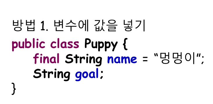 그리고 객체의 시작은 생성자로부터 이기 때문에, 이점을 이용하면 생성자를 이용해 final 변수에 값을 넣을 수 있게 됩니다.