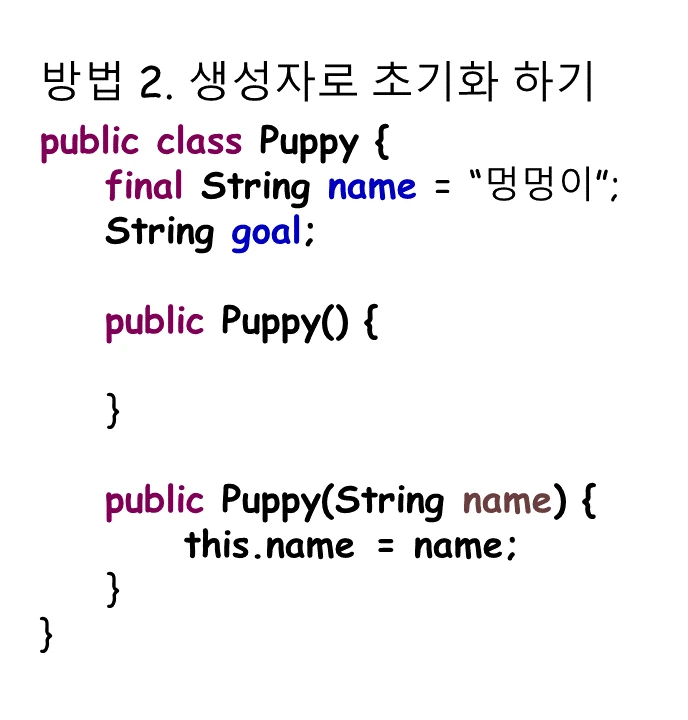 두 번째 방법은 생성자로 초기화하는 방법입니다.