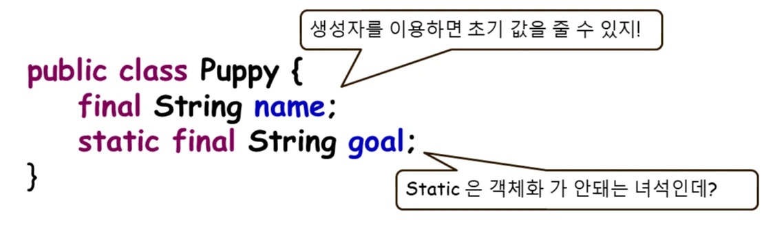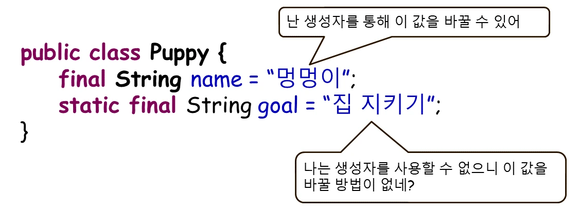 어쨌든 우리는 final 키워드가 붙은 변수는 생성자를 통해 초기값을 변경할 수 있다는 것을 배웠습니다.