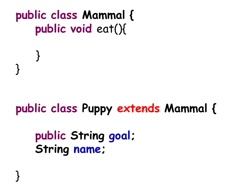위 코드에서 Puppy(강아지)는 Mammal(포유류) 클래스를 상속받았습니다.